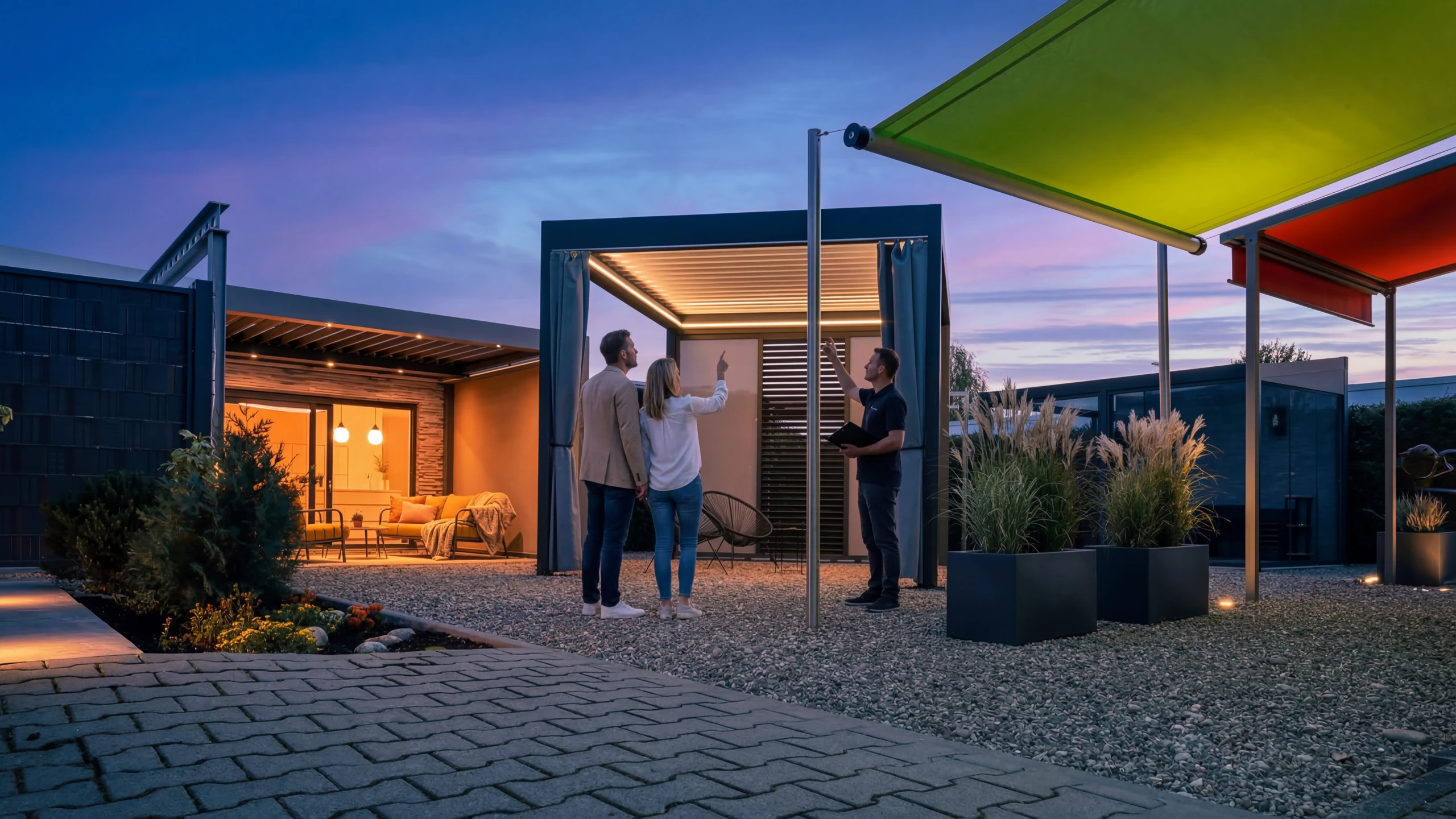 Lamellendächer (Aluminium-Lamellen 0–135°), Terrassendächer und Wintergärten anfassen, bedienen und direkt vergleichen. Keine Fotos, echte Exponate.